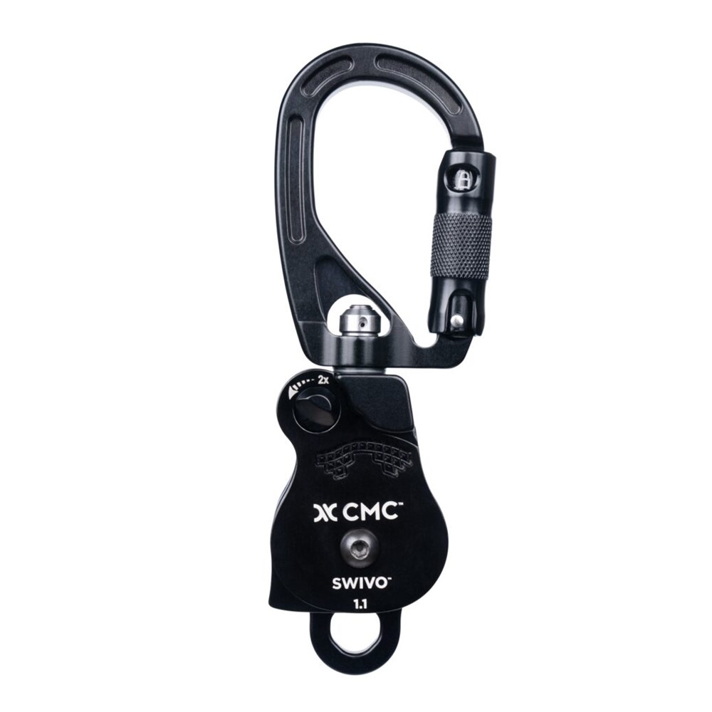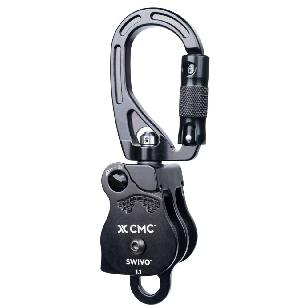 Ergonomic and efficient, SWIVO can be operated one-handed using the double-detent button, pivoting sideplate, and auto-locking gate. It excels in M/A systems and works well with high anchors, tripods, and redirects. Teaming up with Rock Exotica, CMC is offering SWIVO in a single sheave model (NFPA/CE) and a double sheave model (NFPA). The oval carabiner frame is designed for high strength and meets NFPA Technical Use. SWIVO is patented, made in the USA, and brought to you by two companies committed to quality and service.