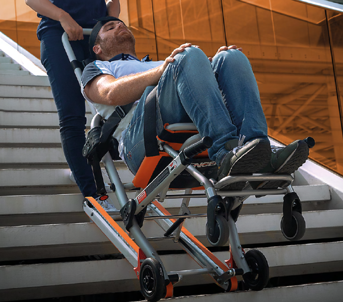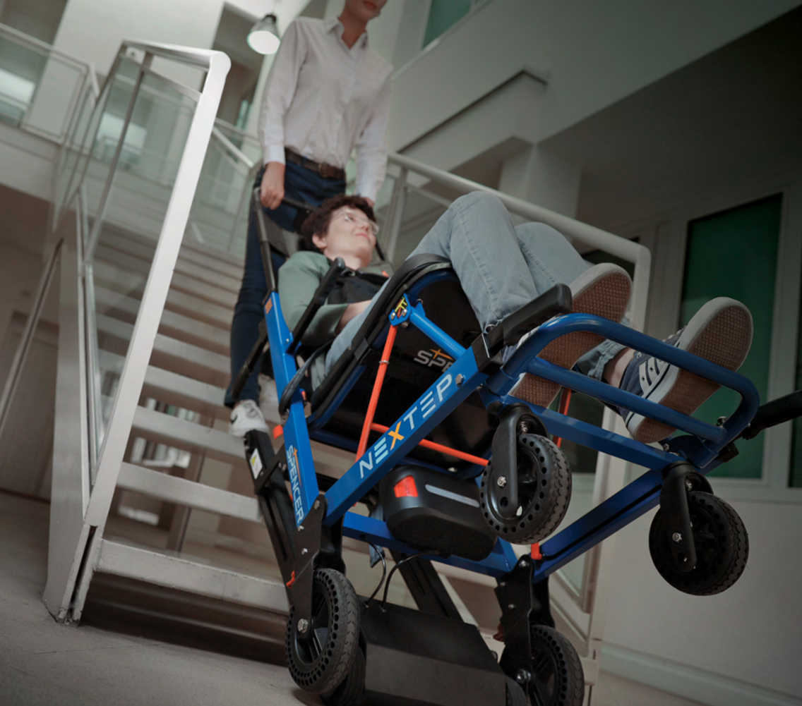 NEXTEP is a powered transport chair designed for patient stair climbing and evacuation. Its powered tracks help to carry individuals with mobility impaired in a controlled, safe and effortless way.